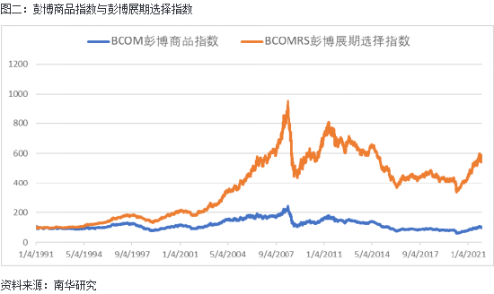 从指数表现来看,以1991年1月4日为基期,起始值100,到2021年12月,彭博展期选择指数值达到550左右,而作为对比同期彭博商品指数则是在98左右,距离基期的100没有太多偏离。