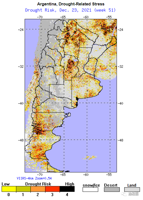 炎热和干燥的天气是由于拉尼娜现象造成的,而粮食主产区巴拉圭东南部的天气最为恶劣。太阳在一年中的这个时候处于最高点,强烈的阳光加上高温(40°C或104°F)和较低的相对湿度,加速了土壤水分的流失。