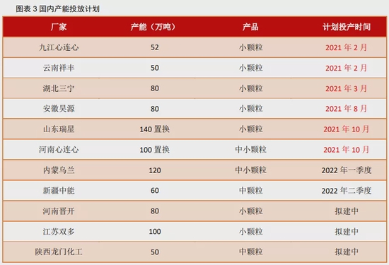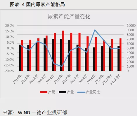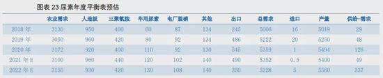 未来几年我国尿素行业共有超过500万吨投产计划,2022年中计划新增产能约200万吨,包括新疆中能60万吨装置、内蒙乌兰120万吨装置,其余投产计划时间尚未明确,需持续关注实际投产时间。2022年煤炭供需格局大概率转为宽松,电煤及化工煤价格或将回落至合理区间,届时尿素行业将保持一定生产利润,企业具有生产积极性,同时中央经济会议提出“新增可再生能源和原料用能不纳入能源消费总量控制”,对于尿素等煤化工行业来说,能耗双控对开工的限制或将大幅降低,预计2022年尿素产量提高3%以上。