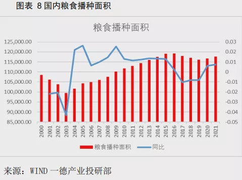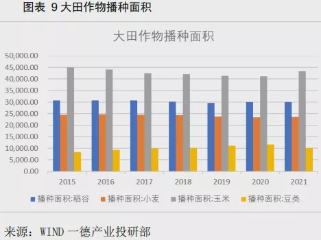 粮食播种面积看,2021年各地严格落实粮食生产责任,加大粮食生产扶持力度,支持复垦荒地,开发冬闲田,提高农民种粮积极性,全年虽部分地区极端天气引发洪涝灾害,西北地区阶段性干旱,但主要农区大部分时间光温水配良好,全国粮食种植面积17.64亿亩,同比增长1295万亩。其中,玉米与大豆种植面积变化较大:全年玉米播种面积约6.5亿亩,同比2020年增加3090万亩,增长达到5%;全年大豆播种面积1.26亿亩,同比2020年下降2200万亩,这主要由于大豆与玉米种植区域重叠,2020年以来玉米价格大幅上涨,种植玉米收益高于大豆,农民种植玉米意愿增强。对于尿素需求来说,玉米种植面积增长会提高尿素施用量,大豆种植面积下降反而影响不大,由于豆类根系上寄居根瘤菌(可以利用空气中的氮元素),对尿素需求低,每亩折纯尿素用量仅约1KG,玉米则每亩折纯尿素用量约6KG。全年小麦及稻谷种植面积分别为,3.54亿亩及4.49亿亩,同比变化很小。