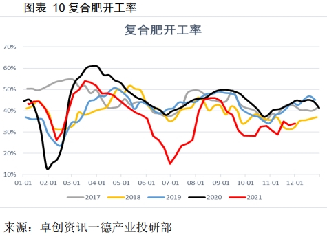 2021年复合肥行业表现十分挣扎,究其原因,首先,氮磷钾三元素作为复合肥的生产原料,2021年均大幅涨价;其次,相比于单质肥原料,复合肥行业的经销商层级更为复杂,价格变动传导更不顺畅;再有,复合肥行业习惯于先收款后生产,这期间原料价格波动产生的风险敞口就都要自己承担,诸多因素造成全年复合肥生产利润大幅压缩,从而导致开工率明显下滑。截至11月底复合肥企业平均开工率约37%,同比2020年-7%,主要原料之一尿素用量明显下跌。