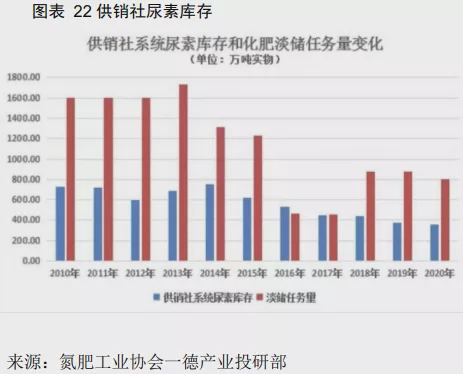 库存水平是供需博弈的结果,我们首先着眼于尿素生产企业库存,对于尿素产业链来说,上游生产企业集中度远远大于中游贸易环节及终端下游,这意味着一般情况下上游的议价能力更强、库存更好统计、库存水平更易体现价格趋势。2021年前三季度,看上去国内表观需求在下降,真实情况是国内尿素供应受限,内外需求表现强劲,产量下滑出口增加,这使得工厂待发充足库存低位,市场价格也随之一路上涨。在尿素价格持续上涨至历史高位的过程中,去化的不仅是显性库存,受“恐高情绪”影响,大部分中下游环节并不敢贸然囤货,隐性库存被真实需求消耗。近年来,由于国内尿素供需格局大幅改变、尿素价格波动相对于其他化肥品种较大、国家淡储任务量变化、运输格局变化等因素,尿素行业隐性库存保持逐年下滑趋势。根据氮肥工业协会数据,2010-2015年供销社系统尿素库存水平维持在600万吨及以上水平,至2020年以下滑至400万吨以下水平,流通环节库存水平下降使其“蓄水池”作用减弱,一定程度上甚至加剧价格波动。进入四季度后,国家高度重视化肥行业保供稳价,保障化肥企业用煤、用电、用气,目前尿素日产同比高位运行;国内用肥进入淡季,淡季时工厂往往靠出口缓解压力,但目前海关对化肥施行法检限制出口,供增需减情况下工厂库存快速累积。短时间内经历价格大起大落,尿素中下游囤货意愿并没有马上增强,需求淡季情况下更愿意观望等待,后期随着国家冬季储备推进,隐性库存或逐渐提升。