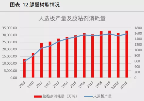 脲醛树脂:脲醛树脂是由尿素与甲醛在催化剂作用下缩聚形成的热固性树脂,它耐磨性、绝缘性较好,价格便宜,是木材加工及人造板胶粘剂中最大的品种,是尿素工业需求用量最大的下游。2010年以来,我国人造板产量迅速提升,至2016年达到3亿立方米后产量转为平稳,脲醛树脂消耗量趋势与人造板产量相同。木材及人造板主要下游为制作家具及建筑,2021年全球疫情好转,上半年国内房地产相关数据同比去年明显增长,对应人造板厂开工及尿素消耗量上升,但下半年国内房地产行业逐步降温,预计全年尿素消耗量同比略增。2022年,房地产行业坚持“房住不吵”的定位,保证刚需但抑制投机需求,各地目标稳住销售面积,在此背景下预计人造板行业及其尿素消耗量保持平稳。