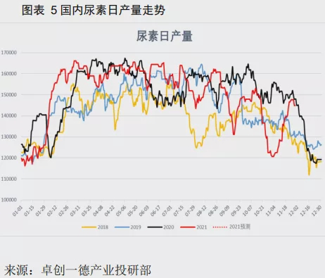受煤炭成本大幅波动、极端降雨天气及故障短停频繁发生、部分地区能耗双控等因素影响,2021年全年产量不及预期,截至11月底,国内尿素日均产量约15万吨,同比2020年下滑约0.3万吨;1-11月份累积产量约5000万吨,同比下滑约90万吨,进入12月后天然气头企业暂无大面积减产计划,12月日产或同比偏高运行,预计全年产量同比下滑约2%。