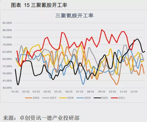 三聚氰胺:三聚氰胺的主要下游为板材饰面及油漆涂料,这同样与房地产行业休戚相关,在全球疫情回暖背景下,2020年4季度开始内外需求强势跟进,市场价格迅速拉涨,全年最高价高达20000元/吨,在高利润影响下,预计全年三聚氰胺产量及出口量明显增加,截至11月份累积产量约131万吨,同比增幅超过10%,截至10月份累积出口量38.07万吨,同比增长约55%。进入四季度以后,三聚氰胺供应保持高位,但内外需求明显转弱,价格及利润大幅回落,预计2022年三聚氰胺外需下降,内需平稳,整体产量将承压下滑。