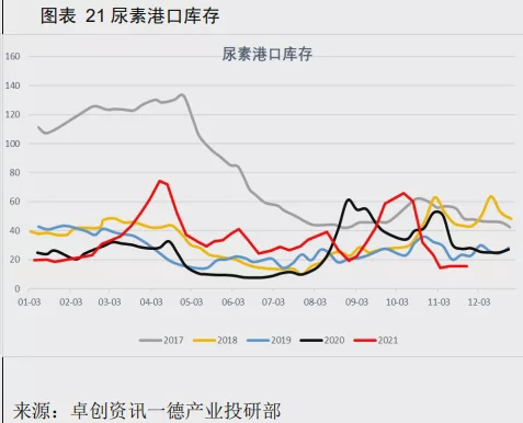 再看港口库存,我国是尿素净出口国,港口库存绝大部分体现出口流向,小部分是国内南北调运。受出口目的地影响,近几年每当有强烈的印度招标预期时,港口库存便呈现增加趋势,库存同样随着印标货物发运而回落,今年4季度海关开始施行化肥法检后,港口库存保持低位运行,预计库存低位将持续至出口政策改变。