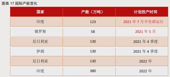 2021年国内尿素计划新增产量超过400万吨,顺利投产的产能超过300万吨,仅乌兰集团的120万吨装置或推迟至2022年投产。其中,九江心连心52万吨装置于2月投产、云南祥丰50万吨装置于3月投产、湖北三年80万吨装置于3月投产、安徽昊源80万吨装置于8月投产、山东瑞星140万吨置换装置于10月投产、河南心连心100万吨置换产能于10月投产;2021年国内装置关停超过200万吨,其中包括:内蒙天野52万吨、河南骏化70万吨、晋煤恒盛30万吨、河南金山30万吨、安阳化学40万吨。综合新增投产及产能关停,2021年国内尿素产能新增约130万吨。