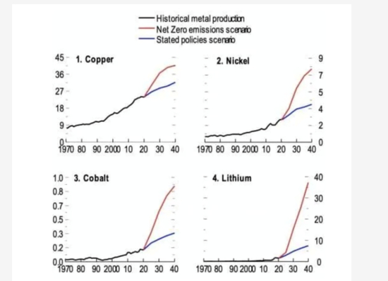 在净零排放情景下,金属生产的价值可能会增长4倍,仅铜、镍、钴和锂在未来20年的总价值就达到13万亿美元。这将与同期石油产量的价值相媲美。