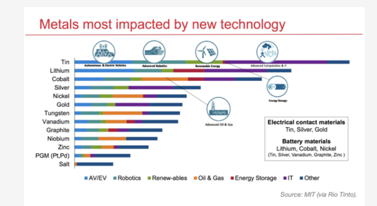 力拓表示,在自动驾驶和电动汽车、先进机器人技术、可再生能源、先进计算和 IT 等技术影响最大的金属中,锡是其次,其次是锂、钴、银、镍和金。