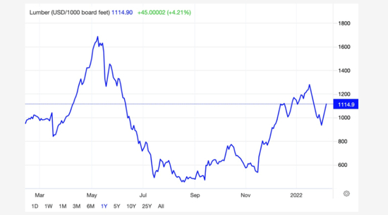 (去年春天,木材价格创下每千板英尺近1,200美元的历史新高,比一年前高出250%。虽然去年8月曾跌至410美元,但木材价格已回升至1,115美元左右。持续强劲根据加拿大森林工业公司的数据,从2021年开始的需求,包括美国新屋开工的增加,加上不列颠哥伦比亚省西北部的供应限制,使价格保持在高位。