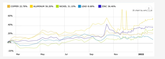 例如,在过去的一年中,供应紧张反映在铜、镍、锌、铅和铝的价格上涨上。