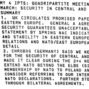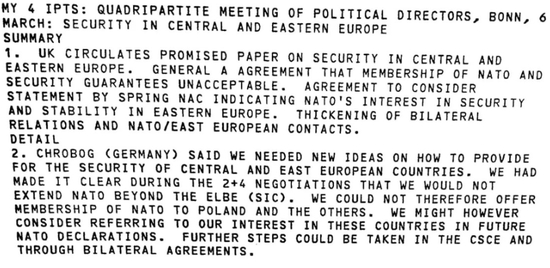 被拿到放大镜下审视的文件来自1991年3月6日的美、英、法、德高级外交官波恩会晤纪要,其中最有价值的发现在于西方国家外交官们明确提及在两德统一“2+4”谈判期间,的确向当时的苏联承诺过北约不会延展到东德以东的区域。