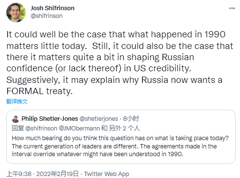 报道发布后,Shifrinson教授也在社交媒体发声,称西方国家外交官当时的确认为他们做出了北约不东扩的承诺。Shifrinson教授也承认九十年代的事情放到今天可能已经意义不大,甚至有涨俄罗斯士气灭美国威风的含义,但这份文件也能解释为何俄罗斯今天想要一份正式的协议。