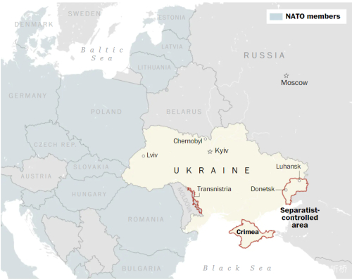 深色国家为北约成员国。黄颜色地区为乌克兰,右下红色线条内为分离主义力量控制的地区(包括卢汉斯克和顿涅茨克)及克里米亚。图:THE WASHINGTON POST