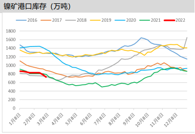 截至2月25日全国港口镍矿库存较前一周下降54万湿吨至732.7万吨,总折合金属量5.76万金属吨,周环比回落6.87%,较去年同期同比上升0.94%。东南亚雨季影响,进口数量下降,加上国内节后复产,镍矿周度降库幅度扩大。