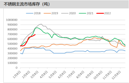 春节期间多数钢厂保持生产,假期后第三周不锈钢整体呈现累库,且速度较快。截至2月24日无锡、佛山不锈钢库存总量为69.46万吨,周环比上升4.1%,年同比下降15.7%,其中300系库存约为50.23万吨,周环比上涨4.6%,年同比下降2.2%。从累库趋势上来看已有明显的走弱。