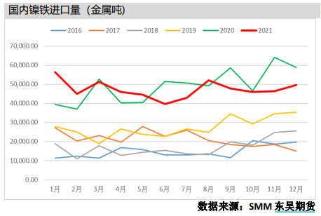 据海关数据显示,2021年12月中国镍铁进口总量为4.96万金属吨,环比增幅7.16%,同比降幅15.51%,其中,从印尼进口镍铁量占总进口量的83.33%,环比增幅27.23%,同比增幅14.81%。此外,2021全年中国镍铁进口总量56.75万金属吨,同比降幅3.65%。