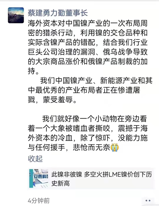 中国最大镍矿贸易商宁波力勤董事长蔡建勇评论称:这是一次海外资本对中国镍产业布局周密的猎杀行动。