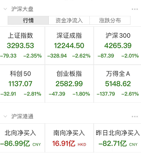 截至收盘,沪指跌2.35%报3293.53点,深成指跌2.62%报12244.5点,创业板指跌1.8%报2582.99点;两市合计成交11099亿元,北向资金净卖出86.99亿元。