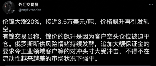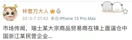 华创分析师称,俄乌战争为催化剂:21年俄镍产量11.5万吨,占全球99.86万吨总产量的11.52%,绝大部分供应中国和欧洲。虽然没有被制裁,但贸易商反馈开证困难,说明短期出口是有问题的。资金逼仓为导火索:据传嘉能可(全球最大有色金属贸易商)逼仓温州某企业(全球最大生产商年产25万吨镍铁)20万吨的空单。另一版本为青山持有15万吨空单,已经平了5万吨。按照启动前2~2.5万美元的镍价推算持仓成本,20万吨浮亏50~70亿美元之间。我们认为具备一定的可信度,温州某企业在期货一直操作比较大,当年也赚过嘉能可等贸易商的钱,同时空镍有逻辑,因镍铁中间品供给量仍在高速增加,镍市场(电解镍+镍铁+中间品)下半年会过剩为市场一致预期,企业提前保值为正常商业逻辑。但问题是上半年镍仍然紧张,特别是中间品供应不足导致电解镍矛盾仍然尖锐。同时,lme只有电解镍能交割,而青山不生产电解镍,套保失效变成投机。另外,我们对比铝价等走势,均受俄乌战争影响和低库存,但铝涨幅远小于镍,说明资金行为影响大。