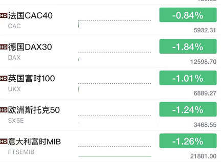 欧股集体低开,德国DAX30指数跌1.73%,英国富时100指数跌1.07%,法国CAC40指数跌0.89%,欧洲斯托克50指数跌1.74%。