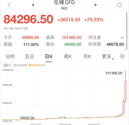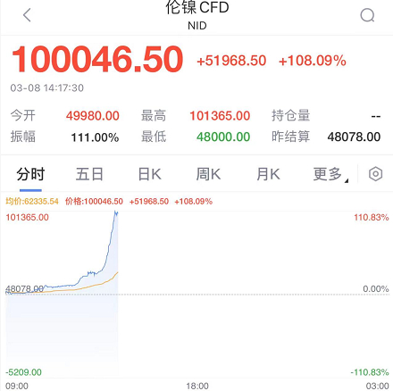 伦镍“历史性逼空”浩浩荡荡进入第二天。3月8日,,逼空行情持续上演,LME镍价日内涨幅扩大至10%,连破6万、7万、8万、9万、10万美元关口,刷新纪录新高。