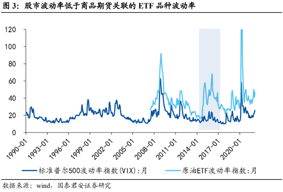 情绪传染方面:期货市场本身的高博弈、高杠杆属性使得其他市场对其波动有较大容忍度。期货市场本身即是一个零和博弈的市场,叠加高杠杆,风险特征较高,因此相比与其他市场,其波动性更可以被整个金融体系所容忍。在2014年,油价暴跌期间,原油ETF的波动率大幅度提升,而VIX指数保持相对平稳,且长期以来原油ETF的波动率均高于股票。因此,从情绪传染的角度看短期影响相对有限。