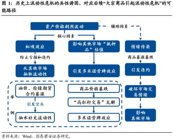 1、历史上流动性危机的共同触发因素及此次商品价格波动诱发流动性危机的可能路径:1)核心因素1:资金的撤离和虹吸效应。某一资产价格剧烈波动,引发虹吸效应,为防止亏损和违约,该市场交易者向别的市场抽取流动性。对于大宗商品市场而言,目前为油价、伦镍期货合约暴涨,引发空头从其他市场抽水补充流动;2)抵押品缩水:这一资产涉及其他市场的“抵押品”估值问题。对于商品而言,主要是价格暴跌后,其他市场的“高杠杆交易”被瓦解,进而引发多米诺骨牌效应;3)辅助因素是恐惧情绪传染,商品价格暴涨暴跌之后,引发违约,破坏市场交易情绪,进而影响其他市场。