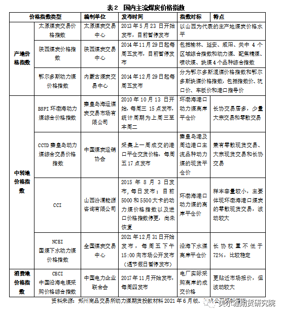 目前,市场上的煤炭价格指数主要分为产地、中转地及消费地三类。其中,产地价格指数主要为“三西”地区各自的煤炭交易中心发布的价格指数;中转地价格指数即港口价格指数,代表性指数为环渤海价格指数(以5500大卡为代表)、CCTD指数、NCEI国煤下水动力煤价格指数、CCI 指数等,该类价格指数使用最为普遍,是现行电煤长协定价的主要依据之一;消费地价格指数的代表为中国沿海电煤采购价格综合指数。煤炭价格指数具体如表2所示。