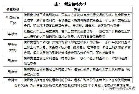 根据煤炭所处的节点不同,可将煤炭价格分为坑口价、车板价、平仓价、库提价等多种类型,具体如表1所示。