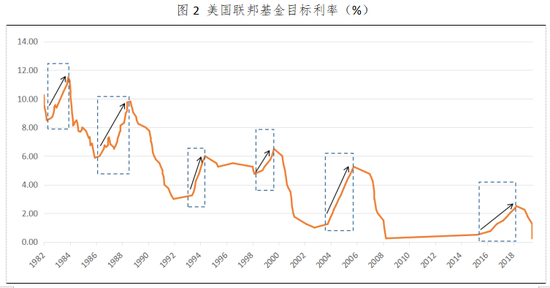 2015年12月—2018年12月:2015年年末,美国失业率降至5%的历史低位水平后,美联储再次启动加息,长期零利率和QE后,美联储开启正常化过程。前期加息节奏谨慎,后期明显加快甚至激进。鹰派程度大超市场预期。