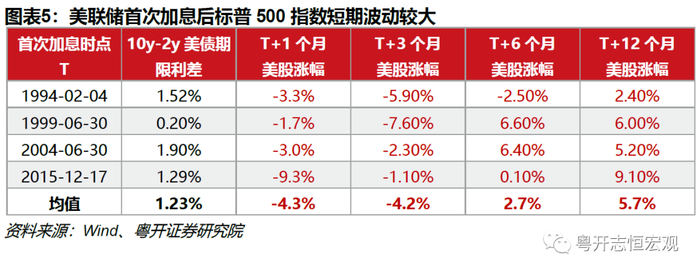 流动性盛宴结束,更快的紧缩周期或对美股美债构成下行压力。债市方面,加息抬升短端利率,缩表抬升长短利率。股市方面,权益资产可能面临估值和盈利双重压力。历史经验来看,1990年代以来美联储的四轮加息周期中,首次加息后1个月、3个月内美股指数普遍下跌,市场需要时间消化风险。