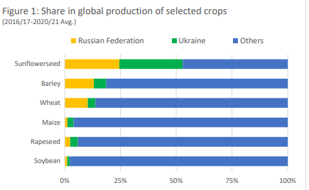 俄罗斯(黄)和乌克兰(绿)在全球农作物产量占比(来源:联合国粮农组织)