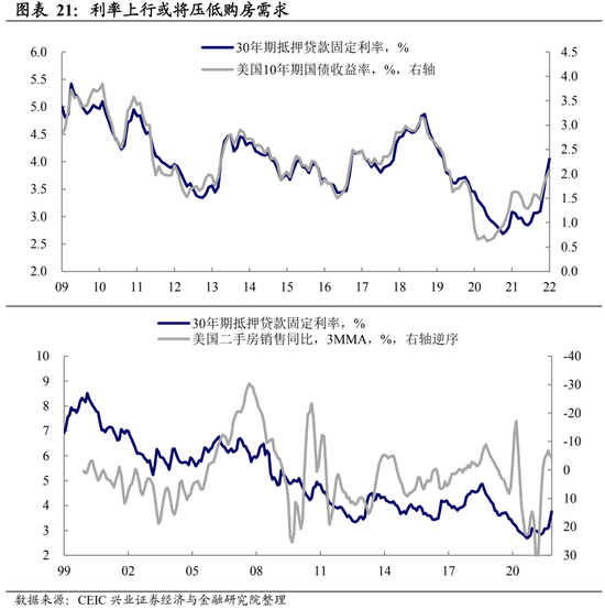 前期复苏的两大支柱商品消费和地产面临逆风,后续修复取决于服务。消费来看,美国商品消费已经透支,然而服务消费仍有缺口,随着美国疫情好转和政策放松,美国消费的支柱或逐渐从商品切换到服务,因此,美国消费的韧性将取决于服务消费。地产方面来看,随着居家办公的减少以及贷款利率的上升,疫情以来火爆的美国地产销售可能将面临降温,但受到疫情对购房需求的长期影响斜率可能不会过于陡峭。