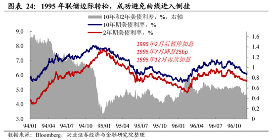曲线形态调节的两条路径:压低短端或抬升长端。逻辑上来看,要防止曲线进入倒挂,主要有两种路径,其一是边际转向,降低短端上行的压力(比如1995年年中的短暂降息);其二是通过资产负债表的调整来侧重性抬升长端利率(2017年10月缩表开启后,长端利率显著上行)。
