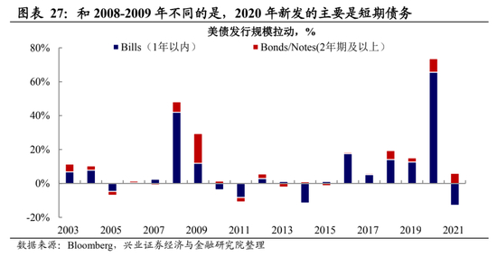 债务偿付的角度看,长端上行对年内美国政府付息压力影响相对有限。与2008年金融危机后不同的是,本轮美国财政刺激新发的债务多为1年以内的短期债务,这使得美国政府部门杠杆率在债务滚动到期后出现回落。从2022年年内到期的债务期限来看,年内到期压力主要集中在短端,这意味着10年期利率上行对付息压力的影响相对有限。而从新增的融资角度,2季度整体来讲是财政部新增融资的季节性低点,这也为长端利率的上行提供了窗口。
