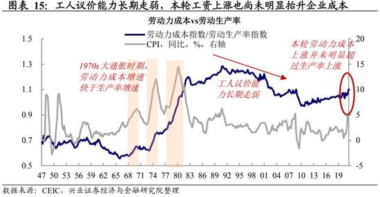 当前还未形成类似70年代的恶性工资-通胀螺旋。1970s大通胀时期,美国劳动力成本增速显著高于劳动名义生产率的增速,这意味着工资上涨在侵蚀企业利润,从而使企业有因为劳动力成本上涨而进一步提价的动力。当前来看,尽管劳动力工资快速上升,但并未明显高于劳动名义生产率的上升,这意味着当前的劳动力市场仍然在供需错配的阶段,而还未进入失锚的水平。