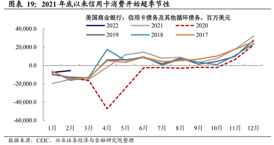 然而,超额储蓄的支撑下,美国居民消费仍有一定的韧性。正如我们在2022年海外年报《缝缝补补又一年》中所详细阐述的,美国经济的回落可能是一个“慢撒气”的过程。多轮财政刺激导致美国居民收入大幅高于疫情前水平,美国居民增加超额储蓄约2.4万亿美元,这部分超额储蓄2021年年底才刚进入消耗期。考虑不同收入群体的消费偏好不同,乐观情形下,其中约有1.2万亿美元将被用于消费,约占美国年消费额的7%,超额储蓄对消费的影响可能将持续到年中。值得注意的是,从消费信贷数据来看,居民信用卡消费额自2021年年底以来超季节性,一方面印证了美国居民正在消耗超额储蓄,另一方面也指向美国居民当前消费倾向仍高。