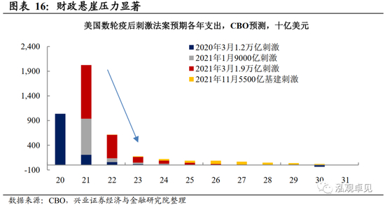 从大逻辑来看,随着财政效应消退,美国经济下行压力降对应加大。美国是此轮全球疫后需求的主要提供者,美国三轮财政刺激总额达5万亿美元,约占全球GDP的5.7%,力度明显高于2009年奥巴马ARRA的财政刺激。根据CBO的预测,2022年多轮刺激的财政支出力度将不及2021年的一半,支出总额将在6000亿美元左右。