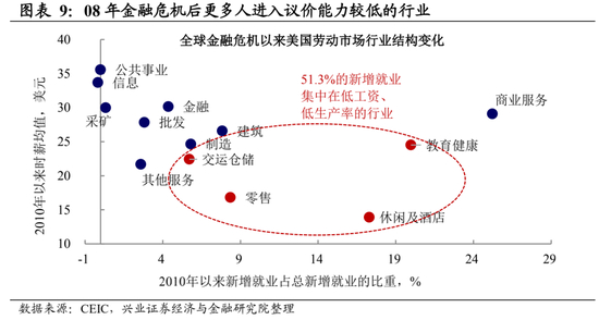 实际上,在疫情前美国劳动力市场就不断趋紧,但工资和通胀水平脱节。当前美国的高通胀是近40年来未曾出现过的,尤其是疫情前的美国正处于劳动力市场紧缺但低通胀的环境。2015年以来,美国劳动力市场就面临着招工难的问题,劳动力市场紧张,而工资并未同步上涨,美国实际通胀水平和劳动力市场出现脱节,这背后的原因主要来自于劳动力市场行业结构的变化。2008年金融危机之后,美国失业率飙升,而就业岗位的减少使得一部分人不得不进入工资议价能力较低的行业,比如交运仓储、零售、休闲及酒店等行业。大量劳动力向低议价能力行业的补充也使得整体工资被压降在了一个较低的水平。