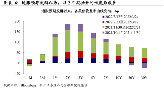 市场不断抬升对通胀中短期走势的预期——美债1-5年期部分计入了更多的通胀溢价。这一点既可以从不同阶段、不同期限美债收益率上升幅度看出,也体现在隐含通胀预期数据上——中短期上升更快。由于此轮劳动力、供应链带来的高通胀是近十年未见的,导致通胀水平和持续性在一开始被低估,于是后期的反补就更为显著;另外,今年俄乌争端导致的大宗品期货价格暴涨,进一步催化了中短期的通胀预期。而3个月的国债收益率可以计入的中短期、长期的通胀预期均有限,更多受到政策利率的直接影响。