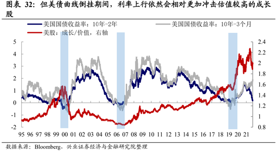 长端美债利率的上行可能尚未结束,警惕利率上行对成长股的冲击。如前所述,要在高通胀压力下联储二季度预期将继续维持鹰派,货币政策紧缩对利率上行的牵引仍将延续。而为了缓解曲线倒挂,联储大概率采取缩表来抬升长端利率,这意味着10年期美债利率的上行可能并未结束。就美股而言,由于历次10Y-2Y曲线倒挂到实际发生衰退的时间有很大差异,倒挂后美股的走势也呈现出较大的不同。对于整体股指而言,短期加息靴子落地之后,股市的重心可能将切回盈利层面。但值得注意的是,在美债曲线呈现熊平的过程中,要随时警惕估值冲杀带来的波动,尤其是高估值的成长板块,受到的潜在压力可能更为显著。