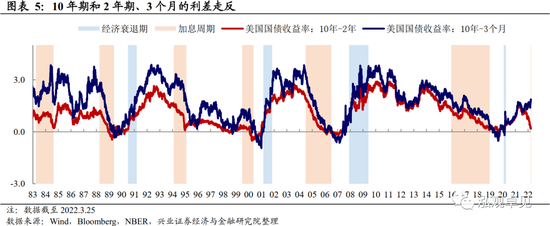 近期,美债10年期和2年期利率均呈现上行,且期限利差快速收窄,截至2022年3月28日22时,10年期和2年期的期限利差已经不足15bp。若期限利差进一步收窄,则可能出现倒挂。历史经验看,10年期和2年期美债利差倒挂往往对经济衰退有一定的预测作用,倒挂后不久联储也往往转向降息。那么在本轮中,美国经济衰退风险几何,联储是否会因此转向?我们将一一探讨。