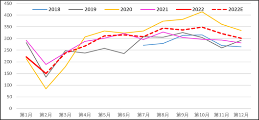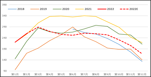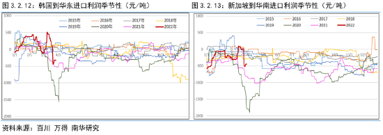 亚洲炼厂优先以生产油品为主,沥青进口利润难以增加额外的进口量,总体予以季节性平均水平评估。我们预估2022年全年沥青净进口量282.67万吨,较去年全年265.65万吨略微增加。