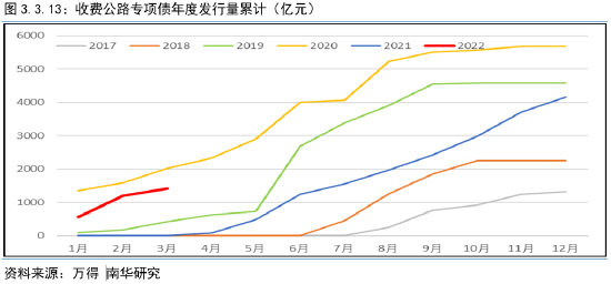 可以看到,今年一季度,地方政府债收益率及交通运输产业债利差反而略微走高。唯一略有亮点的是收费公路专项债,虽然较2020年水平有所差距,但较2021年的同期水平有大幅增加。未来资金端的亮点依然需要相关专项债发行的持续发力,也作为未来基建稳增长的主要工具手段。从一季度的专项债开年水平看,今年全年的资金端支持力度应该不会低,给予我们相对乐观的需求预期。