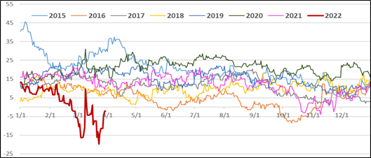 图1.1.2:沥青对布伦特裂解价差(美元/桶)