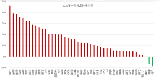 尽管一季度的地产数据表现非常差,地产行业资金也非常紧张,但并没有改变整个大宗商品上涨趋势。从统计的45个活跃品种来看,下跌的品种只有三个,分别是白糖、橡胶和红枣,三个品种都属于农产品,上涨的品种达到42个,品种收益率普遍在5%以上。换句话说,年初只要采取买入持有策略,一直持有到3月31日为止,有86.7%的概率获得超过5%以上的收益。在获得正收益的品种,有17个品种一季度收益率超过20%,收益率在10%-20%之间的品种有10个。它们分别是有色板块:沪镍、沪锡和不锈钢,沪铝和沪锌;黑色板块:焦煤、焦炭、铁矿、硅铁、纯碱和玻璃,热卷、螺纹和郑煤;能化板块:原油、燃油、LPG和PTA,沥青、苯乙烯、甲醇和纸浆;以及农产品板块:菜油、棕榈、豆粕和苹果,豆油等。可以看出,黑色板块除了锰硅之外,所有品种一季度收益率都超过了10%,原材料表现更猛,收益率都在20%以上,地产预期打的非常足。有色板块除了沪铜之外,所有品种收益也都超过10%,沪镍、沪锡和不锈钢则是在20%以上,低库存叠加镍炒作起到主要作用。农产品板块则是主要分布在油脂油料,除了豆油收益率18%,其它收益率都在20%以上,南美洲阿根廷减产以及俄乌事件影响。化工品则是越靠近原料端,涨幅越大,这个主要是俄乌事件的影响,直接将原油推到极高位置,拉动其它能源品种一起走强。