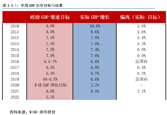 今年3月份,两会召开,总理政府工作报告提出今年GDP增长目标为5.5%,这一目标设定为市场预期的上沿,在全球政治经济动荡的时代,毫无疑问,这一目标的设定相对偏高,实现起来并不容易。但是,考虑到从2010年以来的12年中,政府制定的GDP增速没有达成目标的只有2014年,当年设定目标为GDP增速7.5%,实际为7.4%,偏差为0.1%。在其它年份,则基本达到或者超出预定目标。因此,对于今年政府制定的GDP增速目标,尽管高于市场预期,市场仍然认为实现的可能性更大一些。
