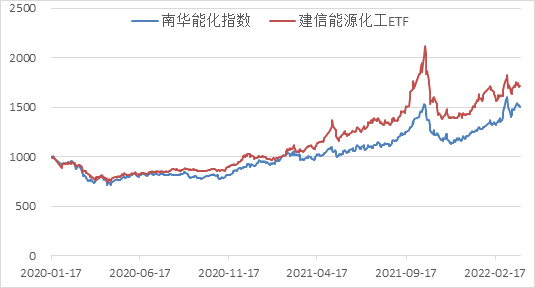 建信能源化工期货ETF于2019年12月13日正式成立,首期募集规模为4.85亿元,三个ETF中发行规模最大。2020年1月17日,在深圳证券交易所上市交易。建信能化ETF跟踪易盛郑商所能源化工指数A,成分品种包含PTA、动力煤、玻璃和甲醇四类,按照成分期货合约在标的指数中的基准权重来构建指数化投资组合,获取指数发展带来的收益。建信能化ETF只包含郑商所化工品种,与南华能化指数有较大区别。截止03月31日,能化ETF净值为1.725,南华能化指数为1.50。从两者走势看,差距逐渐拉大,这主要是因为两者所包含的品种差异太大。南华能化指数不仅包含建信能源化工ETF所有品种,还包含原油及下游油化工等品种,不同品种走势差异必然导致两个指数走势出现差异。