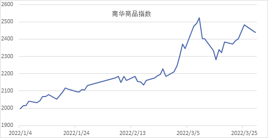 从大周期来看,俄乌冲突引发的能源危机、有色金属以及农产品供应担忧等,打断了本已经进入调整周期的大宗商品走势,使得本已经处于高位的部分大宗商品价格再度创出新高,南华商品指数受其影响也是不断刷出新高。此次事件具有突发性、对大宗商品影响面广以及后续发展不确定性等特点,事件的任何发展都牵动着大宗商品市场的神经,总体市场处于高位震荡走势。